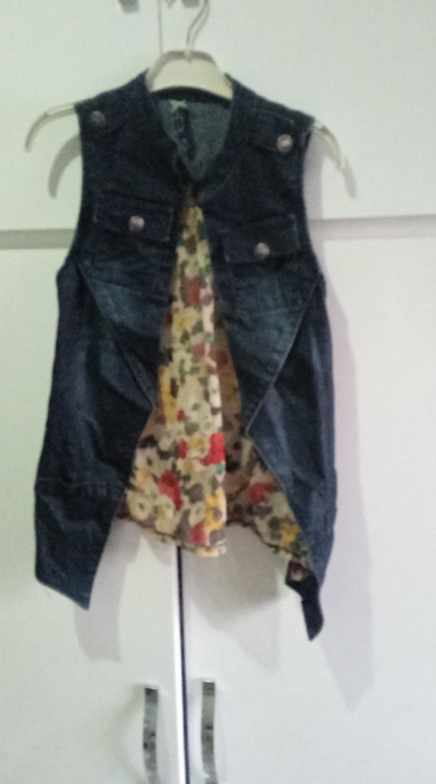 Düğmeli ve kolsuz, notched lapel yakalı, bol kesim midi uzunlukta koyu renkli batik desenli kot ceket.m beden