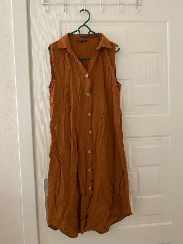 Kolsuz, uzun keten elbise, yakalı ve düğmeli tasarıma sahip, bol kesim ve parlak kahverengi renkte. Günlük sokak stili için uygundur.