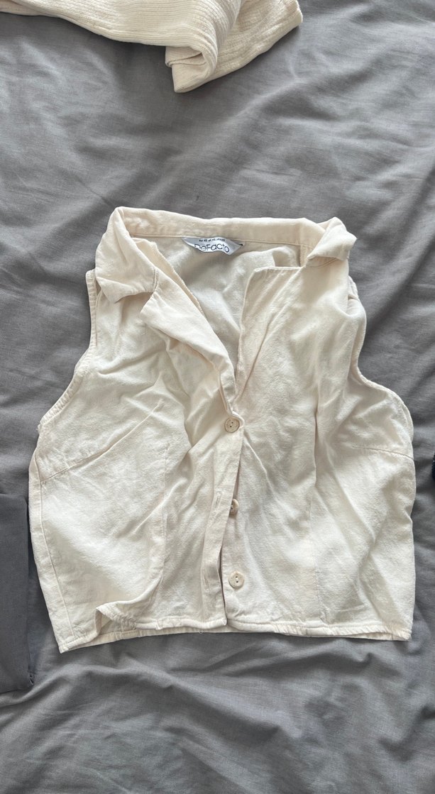 Düğmeli, kolsuz keten gömlek. Yaka detaylı, bol kesim ve sade beyaz renkte, günlük kullanıma uygun.