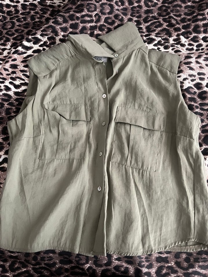 Düğmeli, kolsuz keten gömlek. Salaş kesimli, yakalı ve iki ön cep detaylı. Bej rengiyle günlük sokak stiline uygun.
