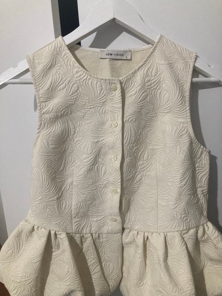 Düğmeli, kolsuz beyaz keten yelek, straplez yakalı ve bol kesimdir. Modern klasik tarzıyla şık bir görünüme sahiptir.