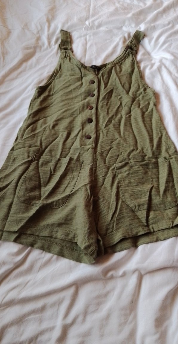 Yumuşak keten kumaştan, düğmeli ön ve yuvarlak yakalı, kolsuz, bol kesim keten tulum. Midi boy, cepli, günlük kullanıma uygun.