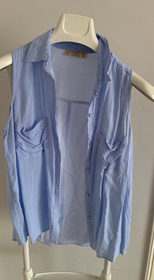 Düğmeli, Kolsuz Mavi Çizgili Kadın Gömlek