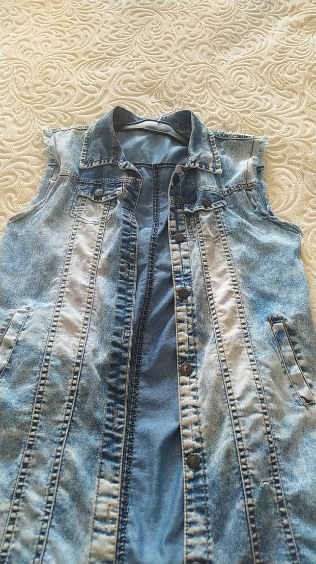 Düğmeli, kolsuz, mavi denim ceket. Straplez yakalı, normal midi boyda, rahat ve şık sokak stiline uygun.