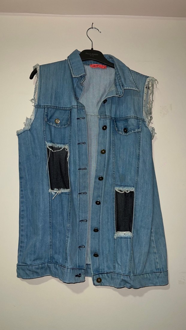 Düğmeli, kolsuz mavi denim ceket, salaş kesim ve straplez yakaya sahip, yırtık detaylarla gündelik sokak stili için ideal.