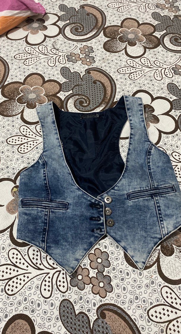 Kolsuz, V yaka ve düğmeli mavi denim yelek. Rahat kesim ve günlük kullanıma uygun normal boyda. Tie-dye deseni mevcut.