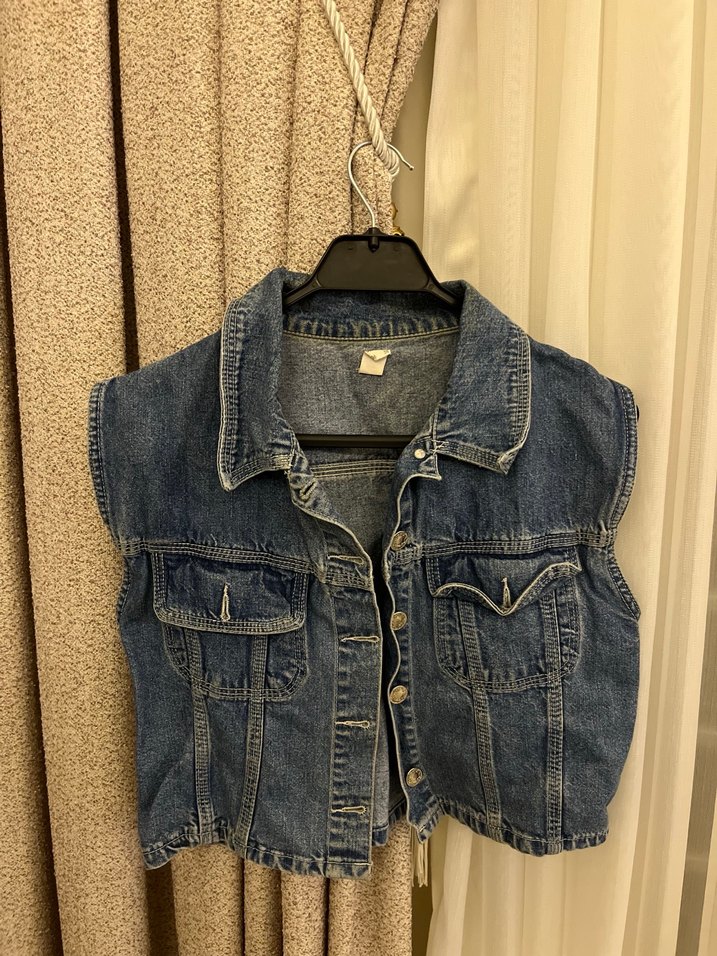 Düğmeli, kolsuz, mavi denim yelek.