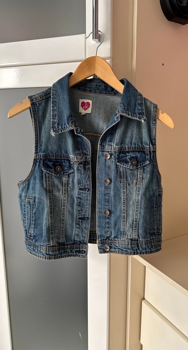 Düğmeli, kolsuz ve fitted kesime sahip bu denim yelek, notched lapel yakaya sahiptir. Mavi ve gri tonlarda tie-dye desenli, casual streetwear tarzındadır. Normal midi uzunluktadır. Sadece yaka uçlarında fotoğrafta belirtilen deformasyon var.
