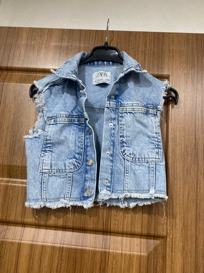Düğmeli, kolsuz mavi denim yelek. Notlu yaka ve normal boyda, rahat kesimli, günlük sokak stili için uygun. Göğüs 37 cm boy 39 cm