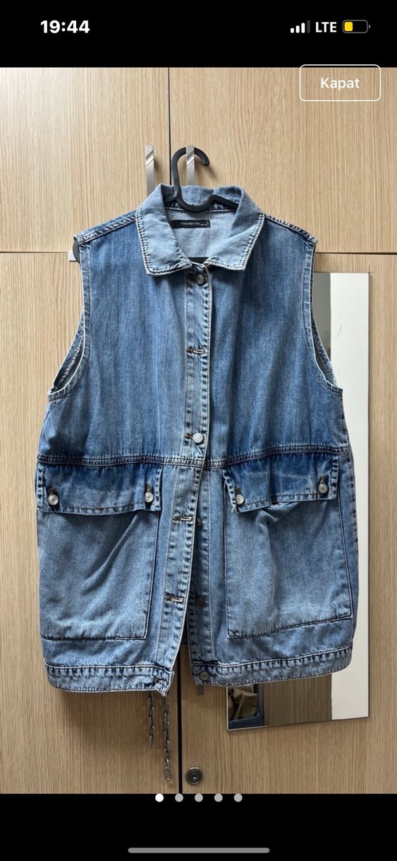 Düğmeli, kolsuz, bol kesim mavi denim yelek. İki ön cep ve klasik yaka detaylarıyla günlük rahat stil için uygun.