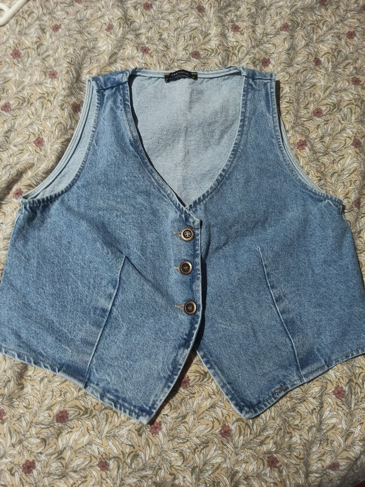 Düğmeli, kolsuz, mavi kot yelek. Gevşek kesim ve askısız yaka ile vintage sokak stili için uygun.