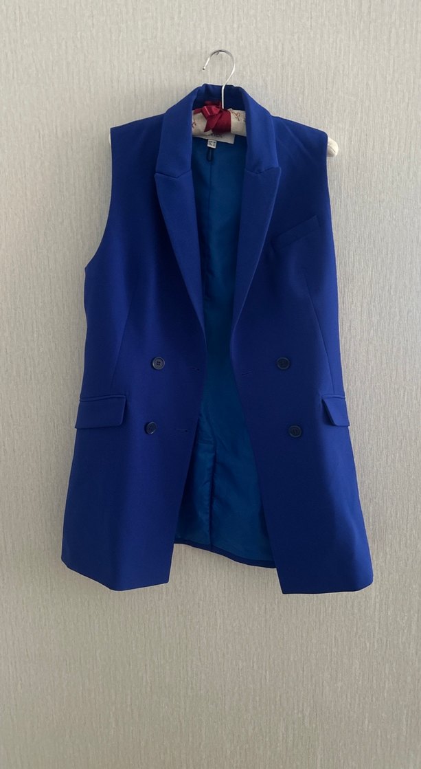 Kolsuz, kesik yakalı ve düğmeli mavi blazer. Normal kesim ve midi boyda, ofis ve günlük sokak stili için uygun. Pürüzsüz sentetik kumaştan yapılmıştır.