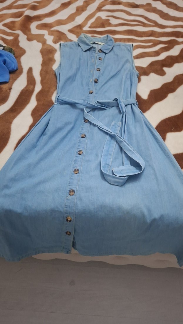 Düğmeli önü, yakalı ve kolsuz uzun denim elbise. Regular fit ve bel kemeri ile günlük rahat kullanım için uygundur.