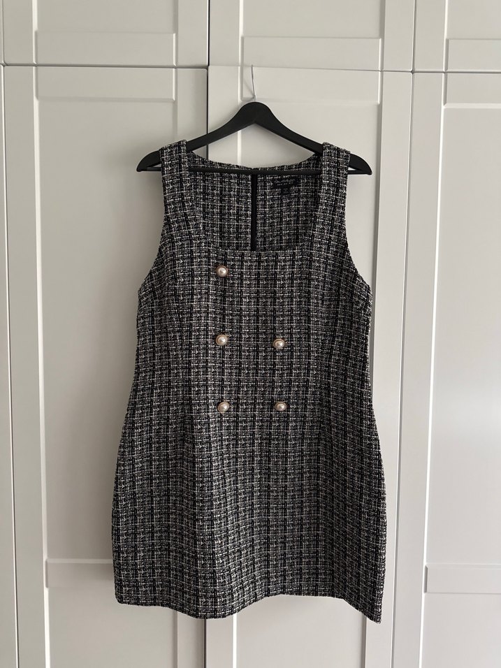 Ekoseli kumaş detaylı, mini boy elbise. Ön kısmında inci görünümlü düğmeler bulunur. İki koltuk 48 cm. Bel 46cm. Etek/basen cevresi 56cm. Boy 86cm. 1 düğmesi resimde elsik ama yaninda göndericegim. İçi siyah astarlı.