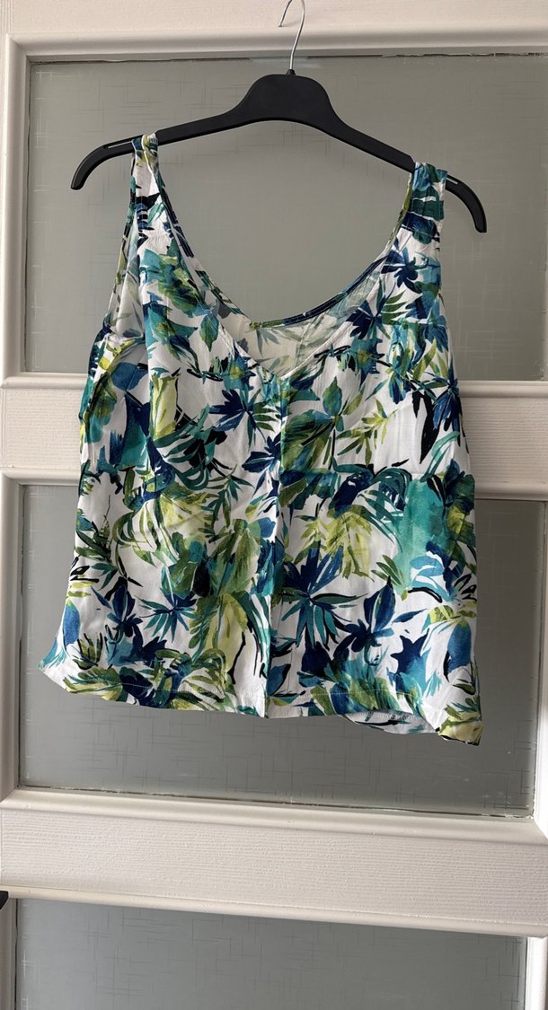 Kolsuz ve askısız kısa bluz, düğmeli ön detaylı ve bol kesimdir. Sentetik kumaştan yapılmış, açık ve çok renkli tie-dye deseni ile bohem tarzını yansıtır.