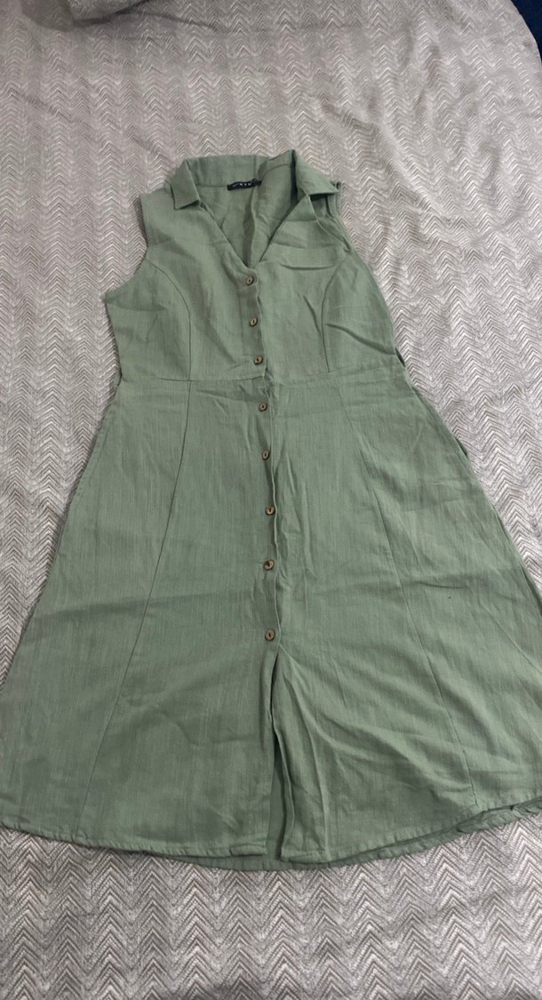 Kolsuz, V yakalı keten elbise, düğmeli ön detaylıdır. Salaş kesimi ve bohem tarzıyla günlük kullanıma uygundur. Yeşil renktedir. Kemeri kayıp