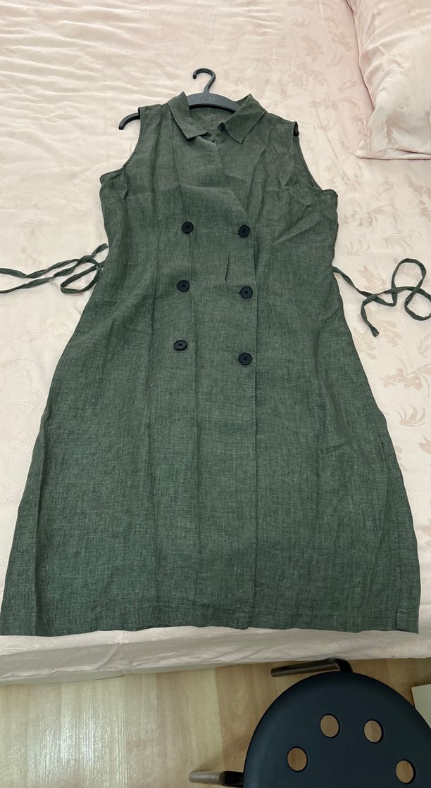 Yeşil renkte, keten kumaştan yapılmış, kolsuz ve uzun boy düğmeli elbise. Notlu yaka ve rahat kesimiyle gündelik kullanıma uygun.