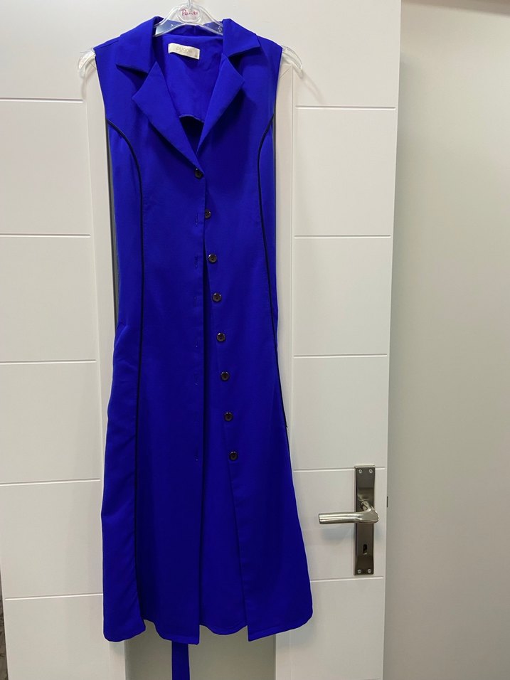 Düğmeli Kolsuz Uzun Mavi Kadın Elbise