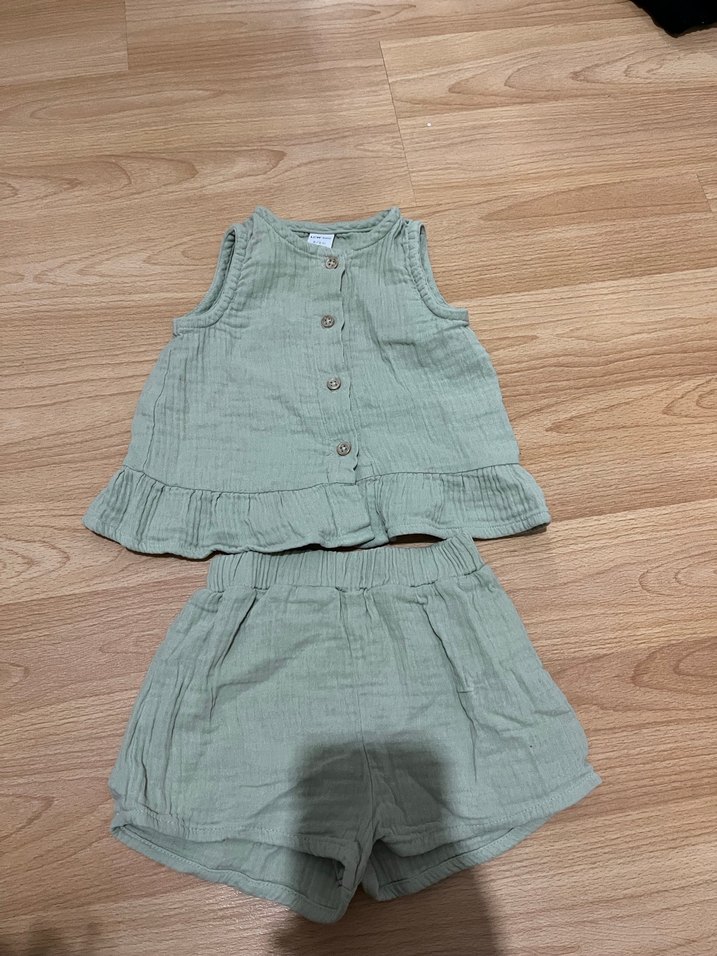 Yumuşak yeşil kumaştan, düğmeli ön detaylı kolsuz bebek kıyafet takımı ve rahat şortlar.
