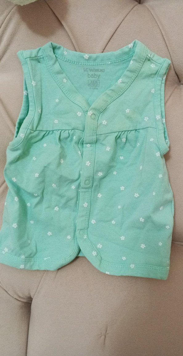 Pamuklu, düğmeli ve kolsuz yeşil bebek yeleği, rahat ve salaş kesimlidir. Küçük çiçek desenleriyle sade bir görünüme sahiptir.