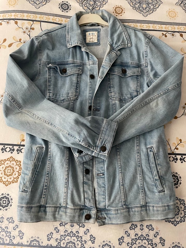 Gri renkte, düğmeli, uzun kollu, normal boyda, salaş kesim kadın denim ceket. Notch yaka ile günlük sokak stiline uygun.