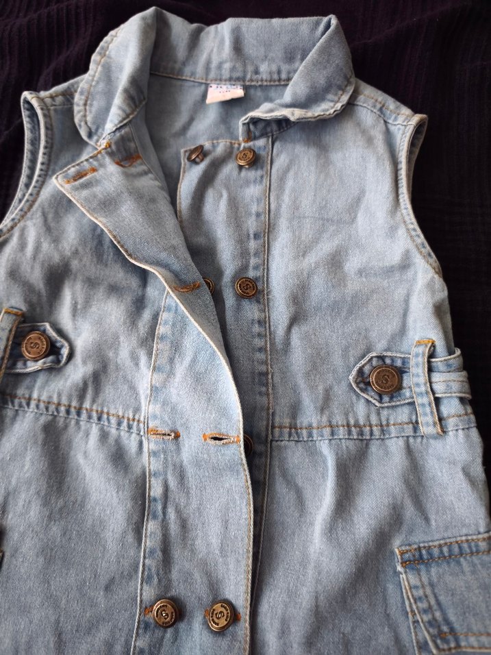 Kot kumaştan yapılmış, düğmeli, yakalı ve kolsuz elbise.etiketli ..4 yaş diyor ama 3 yaş içinde uygun
