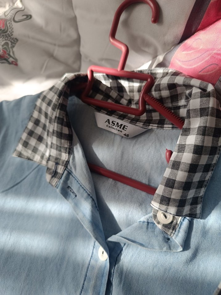 Kadınlar için düğmeli, yakalı ve askılı kollu, fitted kesim kot gömlek. Mavi ve gri tonlarda, baskılı desenli, günlük kullanıma uygun midi uzunlukta. ASME markası.