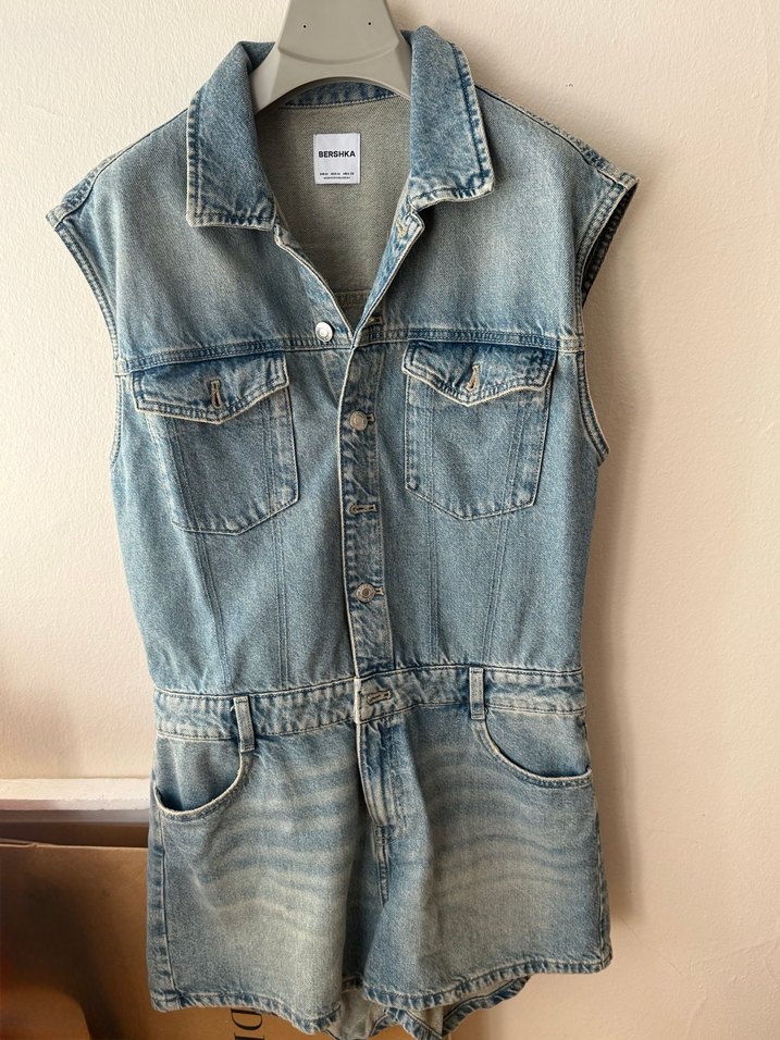 Düğmeli ön kısmı, bol kesimi ve kayışsız yaka tipi ile kot kumaştan yapılmış kolsuz tulum. Cep detayları ve gündelik sokak stili sunar. Hiç giyilmedi.