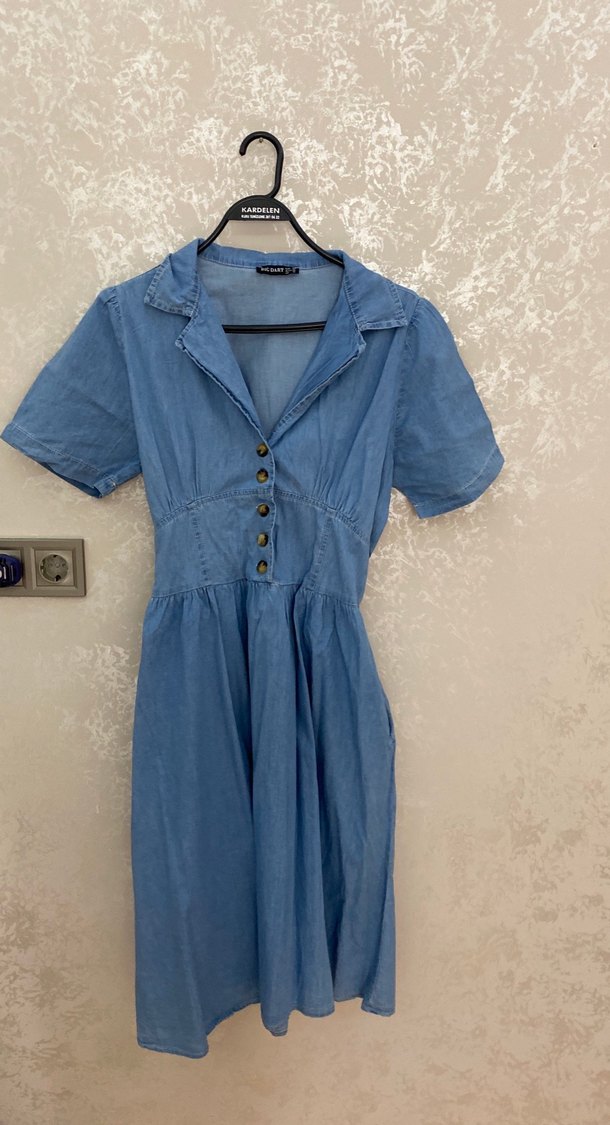 Pastel mavi renkte, düğmeli ve yakalı kot midi elbise. Kısa kollu, bol kesim ve günlük sokak tarzı için uygun.