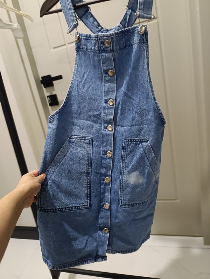 Mavi-gri kot kumaştan, düğmeli ve iki ön cepli, straplez yakalı ve kolsuz, bol kesim midi kadın salopet. Günlük rahat sokak stili için uygundur.