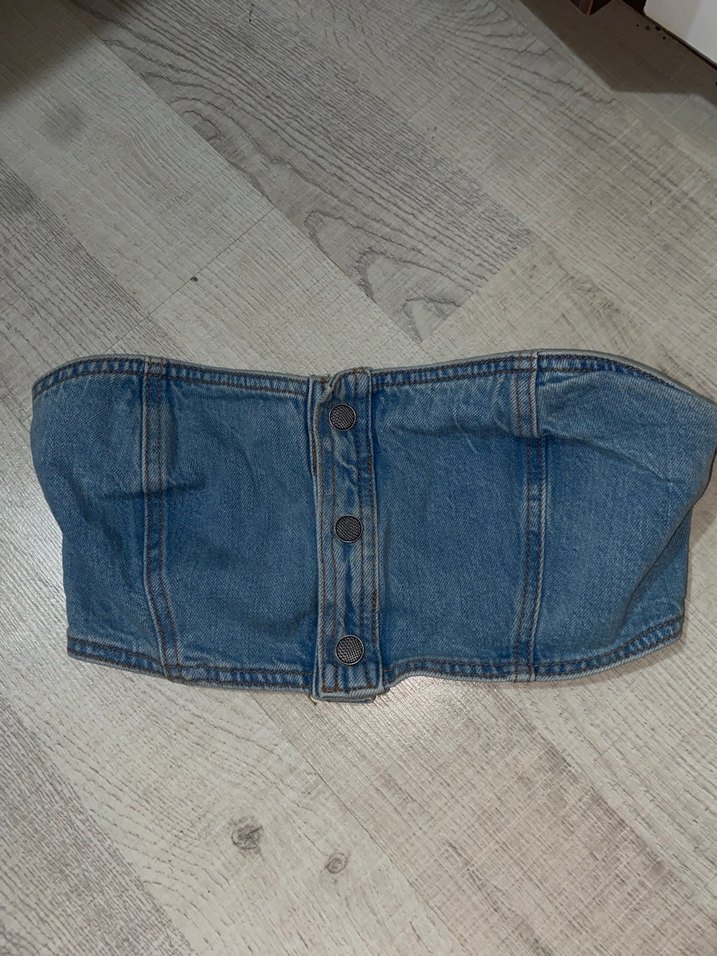 Düğmeli önden kapamalı, kot kumaştan yapılmış, straplez ve vücuda oturan midi uzunluğunda günlük sokak stiline uygun bir büstiyerdir.