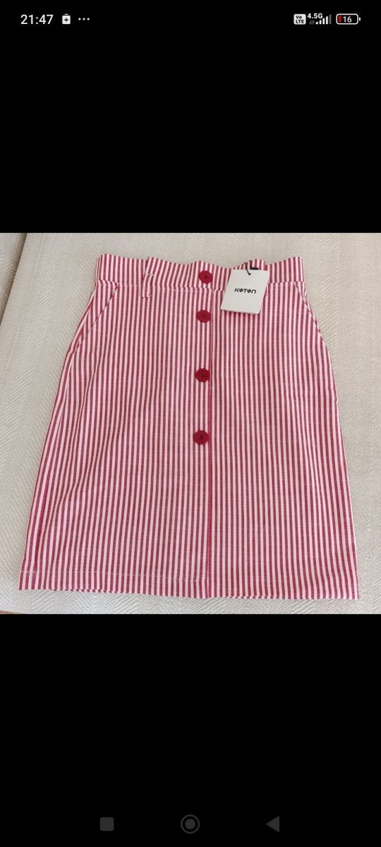 Düğmeli ön kısmı ve regular kesimi olan, yumuşak pamuk kumaştan üretilmiş kırmızı çizgili mini etek.