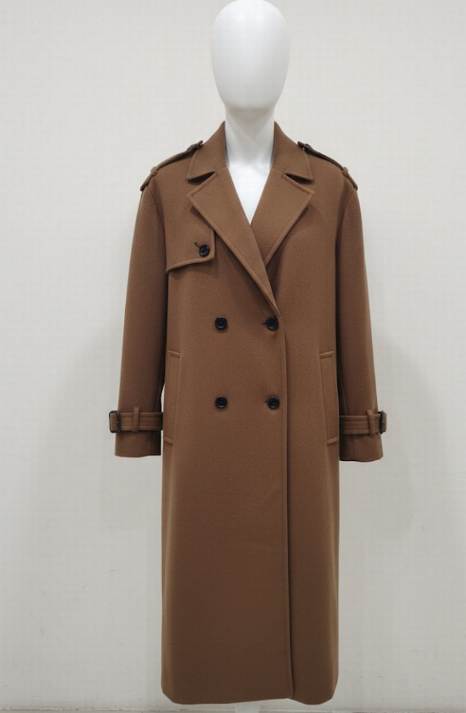 Kadınlar için düğmeli, uzun boy, koyu bej renkte kaban. Notlu yaka, uzun kol ve klasik, desensiz tasarıma sahiptir. Yumuşak ve sıcak kumaştan üretilmiştir.
