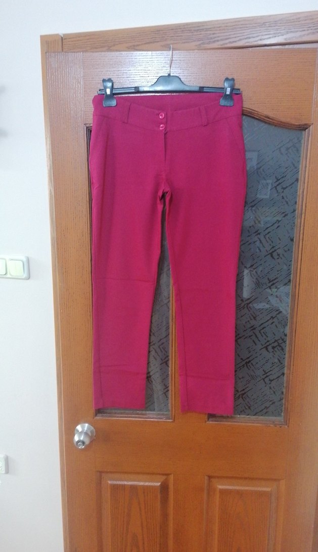 Düğmeli ön kısmı ve bordo rengiyle, sentetik kumaştan yapılmış dar kesim kadın pantolonu. Midi boy ve günlük kullanıma uygun.