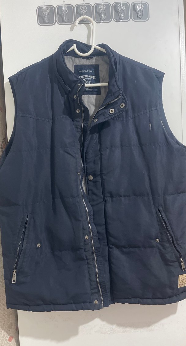 Düğmeli, yakalı ve fermuarlı cepli koyu gri denim yelek, bol kesimiyle rahat ve günlük sokak tarzına uygundur İş kiyafeti olarak kullanıla bilir.