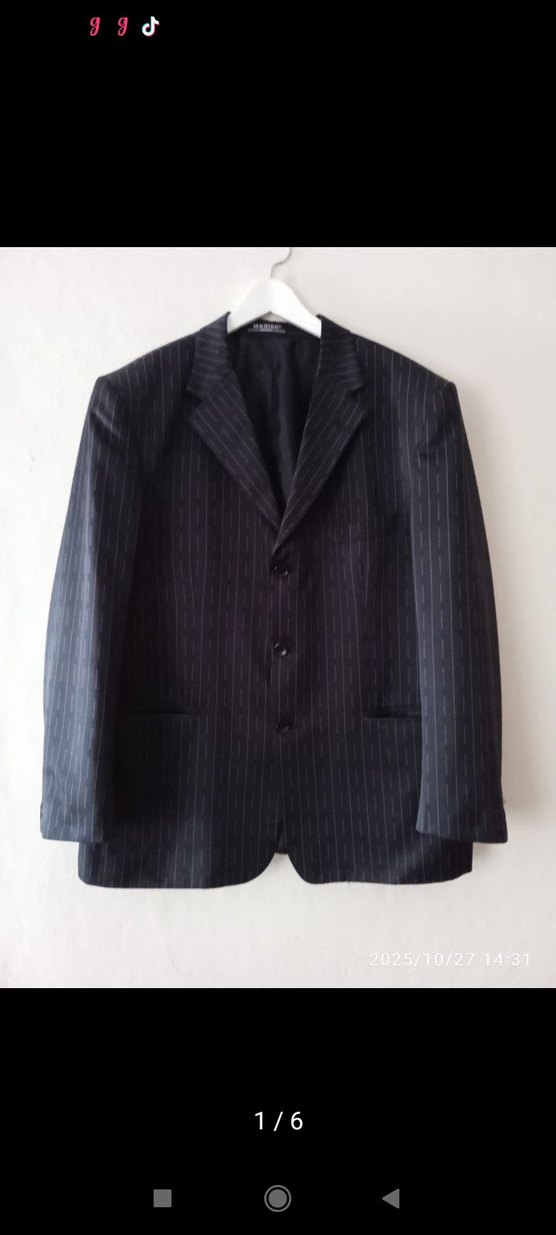 Düğmeli, koyu gri erkek takım elbise ceketi, klasik kesim ve düz desensiz tasarımla ofis için uygundur. Notch yakalı ve uzun kolludur.
