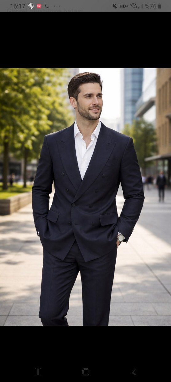 Düğmeli, koyu mavi ince renkli çizgiler erkek takım elbise ceketi ve pantalon. Notch yakalı, regular fit ve uzun kolludur. Ofis için klasik ve sade bir tarza uygundur. 44 bedene uygundur 112 cm ceketin eni pantalon beli 88 cm