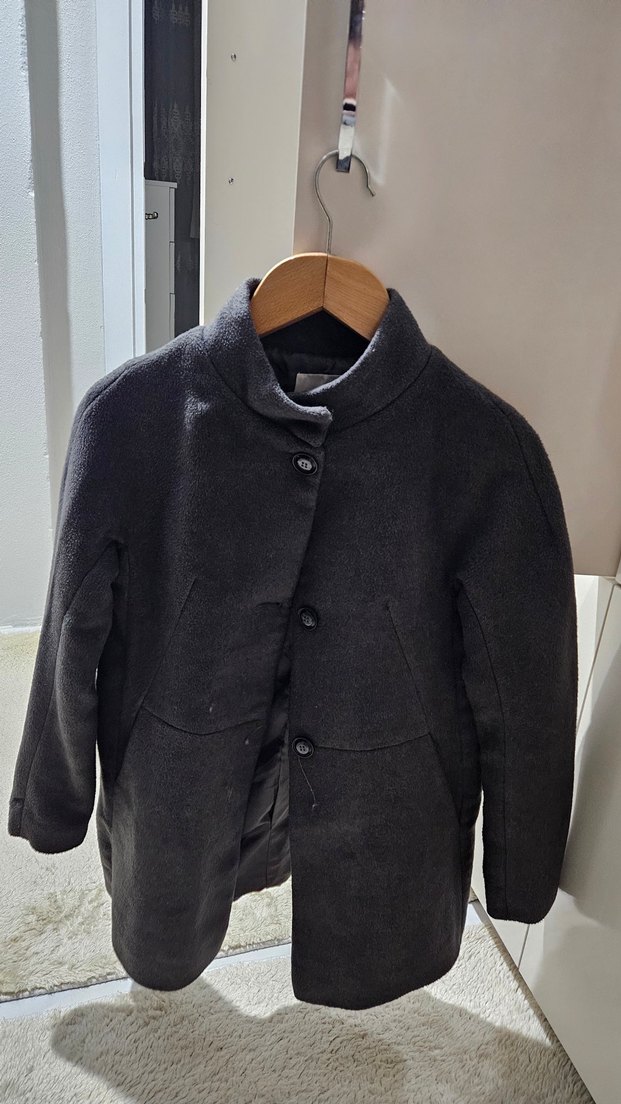 Düğmeli, yakalı koyu gri kaban, ön ceplerle kullanışlı bir tasarıma sahiptir.