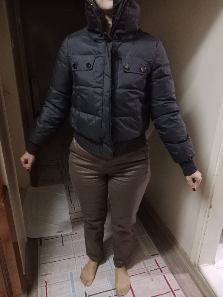 Düğmeli önü kapamalı, koyu gri renkli, sentetik kumaştan yapılmış, uzun kollu ve normal boyda kadın kışlık mont. Notlu yaka detayı ve rahat sokak stili sunar. ❄️