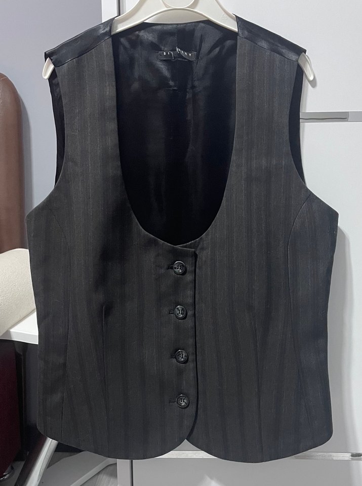 Düğmeli, koyu gri renkli, çizgili kumaştan yapılmış, arkası siyah saten kumaştan kolsuz kadın yeleği. İş ortamları için uygundur.