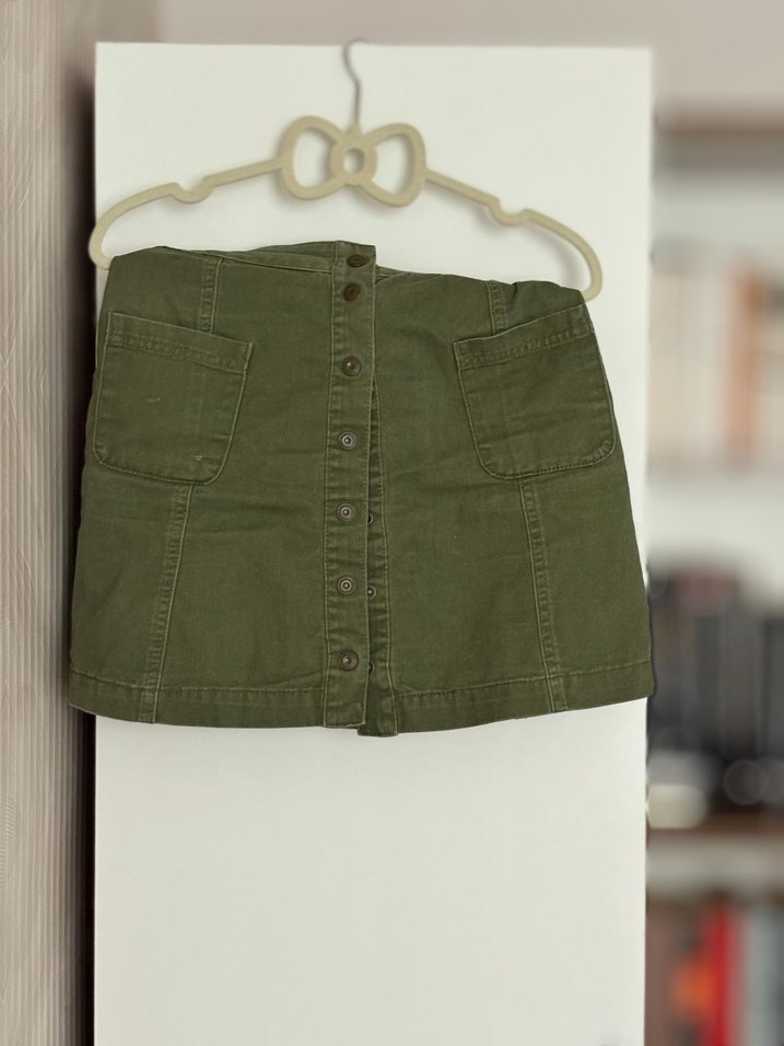 Düğmeli, ön cep detaylı, koyu haki renkli, fitted kesim denim mini etek. Günlük sokak stili için uygundur.