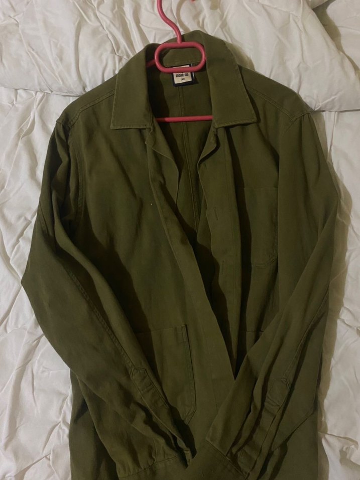 Düğmeli, keten kumaştan yapılmış, koyu haki renkli, uzun kollu ve notched yaka özellikli bol kesim ceket. Günlük kullanıma uygun minimal tarzda. Vintage