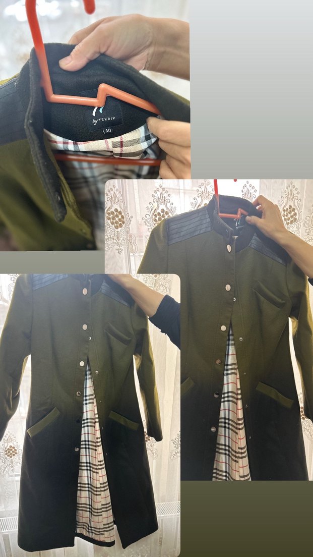 Düğmeli, fitted kesim, uzun kollu koyu haki midi kaban. Notch yaka ve kaşe kumaştan, sokak modasına uygun şık bir parça.