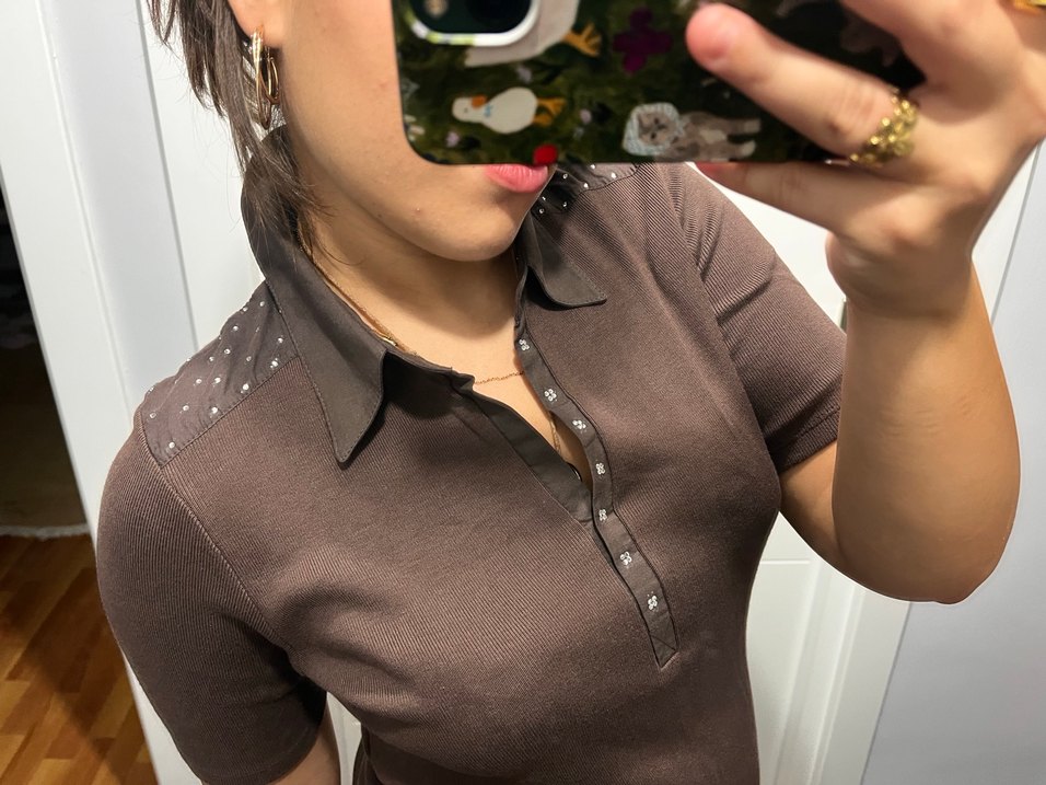 Düğmeli, baskılı detaylara sahip, yakalı ve kısa kollu koyu kahverengi deri polo tişört, trend sokak stili için uygun.