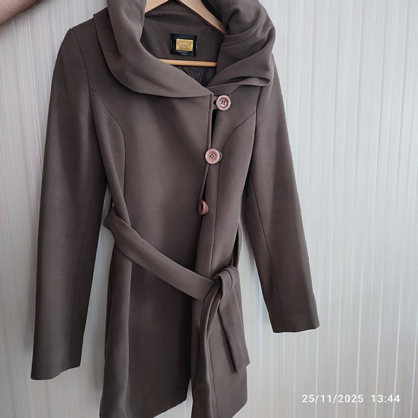 Düğmeli, bel kuşaklı koyu kahverengi kaban. Geniş yakalı, yumuşak ve sıcak tutan kumaştan üretilmiştir.