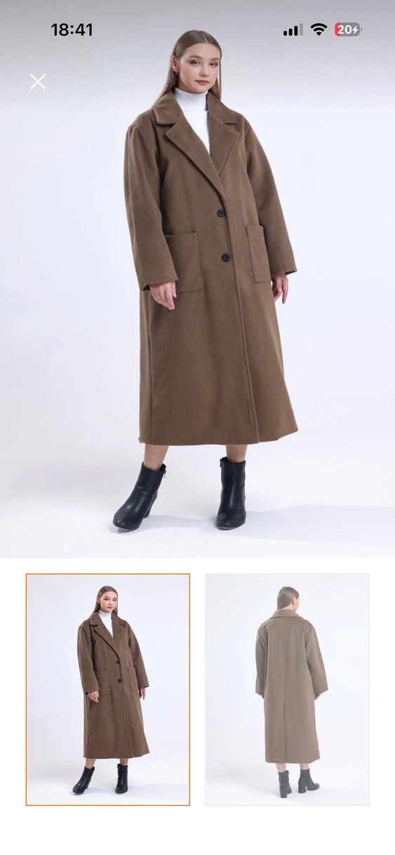 Düğmeli, koyu kahverengi uzun kaban, büyük ön ceplerle klasik ve şık bir görünüm sunar. Yumuşak ve sıcak kumaştan üretilmiştir.