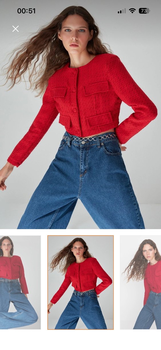 Düğmeli ön yüzü ve normal kesimiyle koyu kırmızı tüvit ceket, dokulu kumaştan günlük kullanım için uygundur.