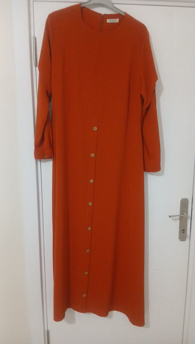 Düğmeli, uzun kollu ve kayık yaka tasarımlı koyu tu4uncuı uzun elbise. Rahat kesimi ve minimalist stiliyle günlük kullanıma uygundur. boy1.47 gogus kısmı 56 cm bel 52 gerı iade yok
