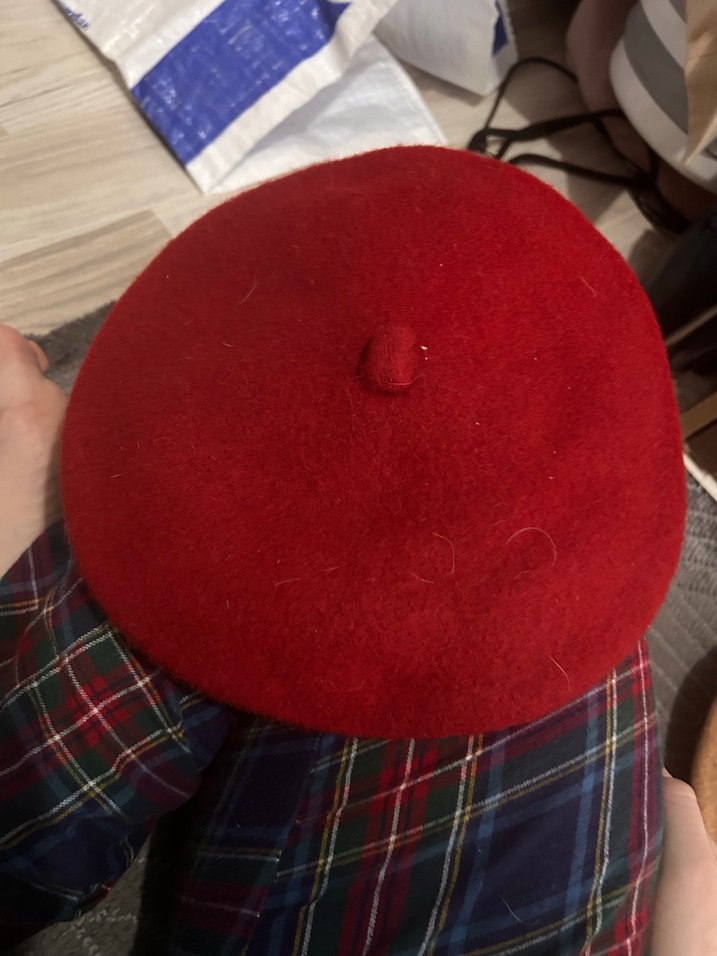Koyu kırmızı yünden üretilmiş, düğmeli, yumuşak dokulu kadın bere. Rahat ve eski tarzı yansıtan bir modeldir.