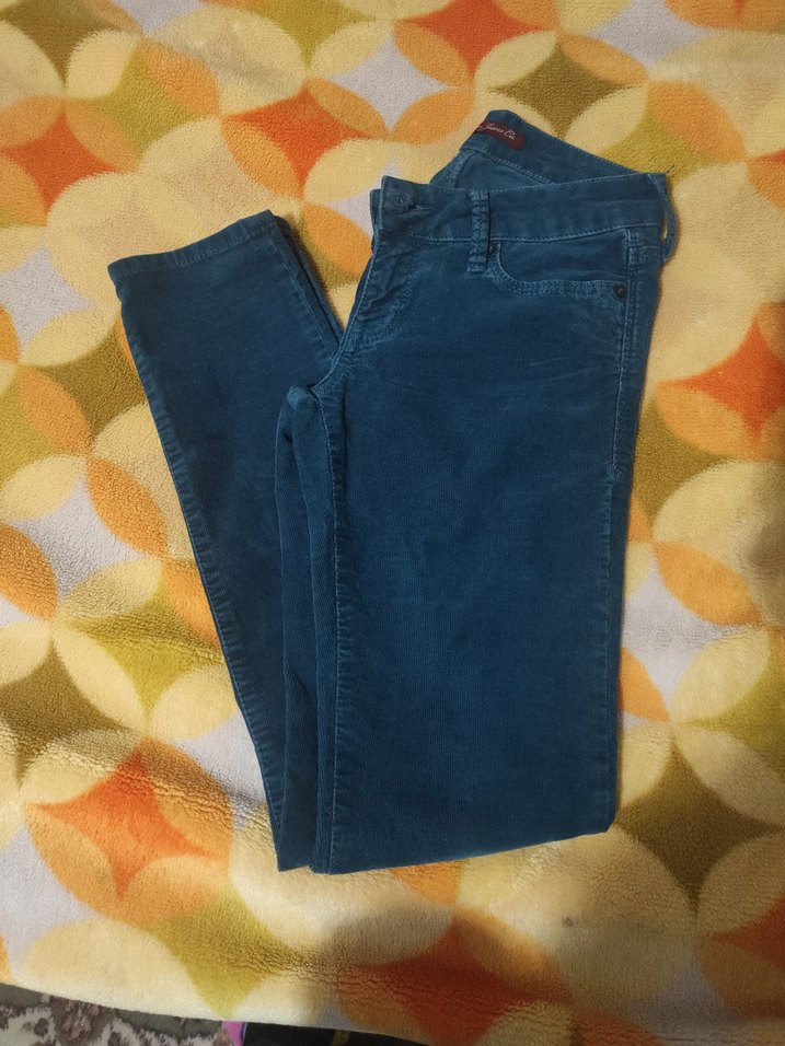 Düğmeli, batik desenli koyu mavi kadife pantolon. Rahat kesimiyle günlük kullanıma uygundur.